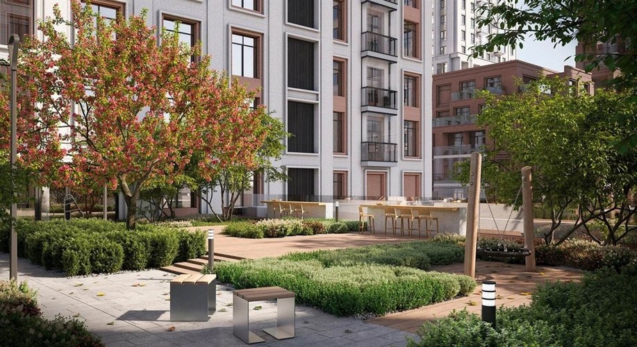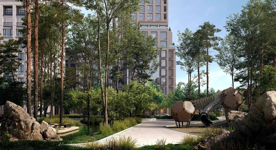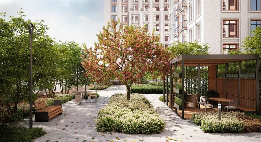 В ландшафте дворов соединены японский минимализм, пэчворк и традиционный подход к озеленению. Предполагается обустройство камерных садов с функциональными зонами — для игр, отдыха, спорта. Взрослые деревья, кустарники и травы сформируют разноуровневый зелёный каркас, который круглый год будет радовать глаз. На променадных улицах также сразу будут высажены большие деревья.